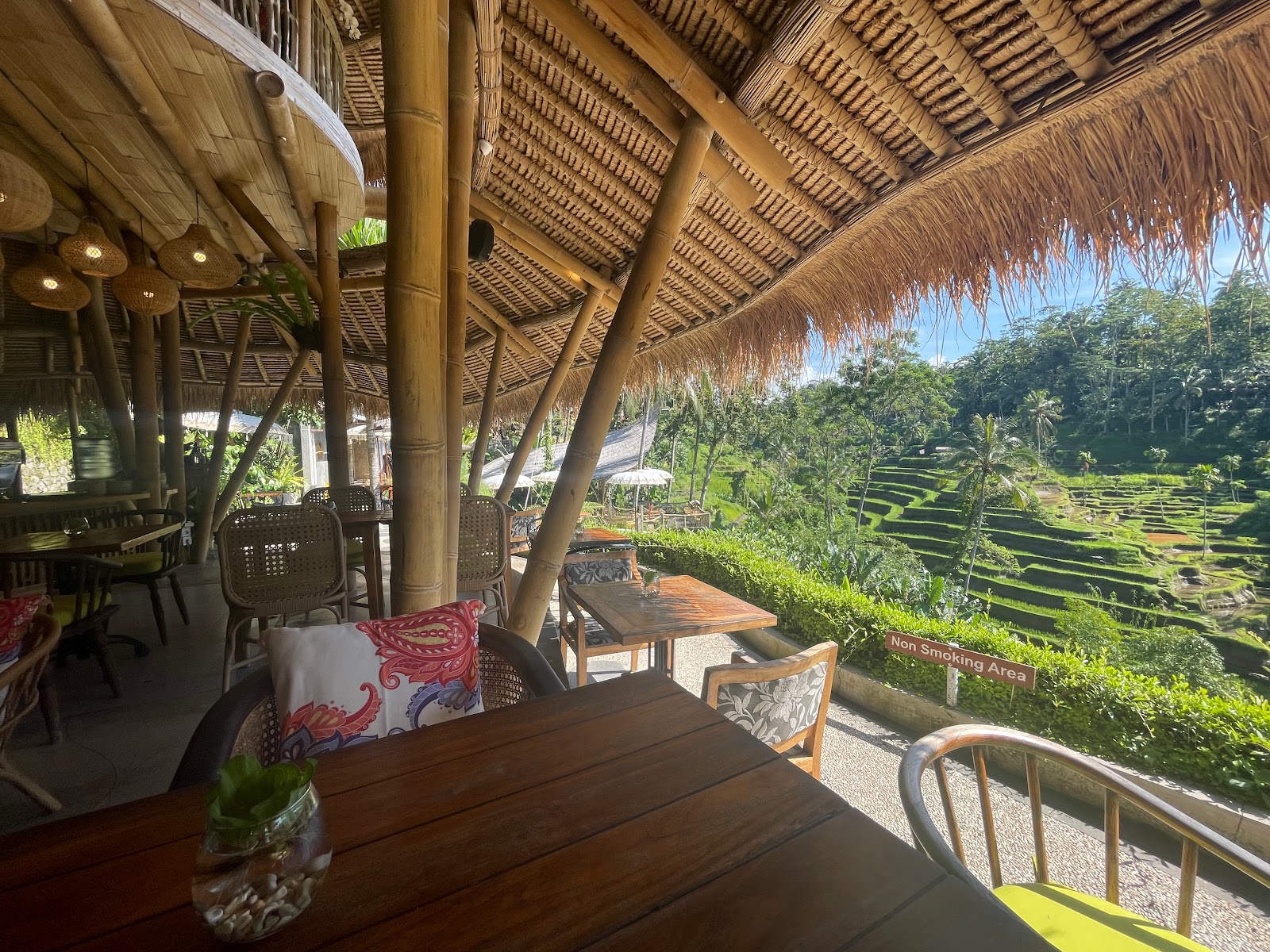 Di sini, setiap sudut terasa hidup: udara segar dari persawahan, cahaya matahari yang masuk lembut melalui sela-sela atap, serta aroma kopi yang menyatu dengan nuansa tropis Bali. Semuanya berpadu menciptakan pengalaman bersantap dan bersantai yang menenangkan, estetik, dan penuh energi positif.