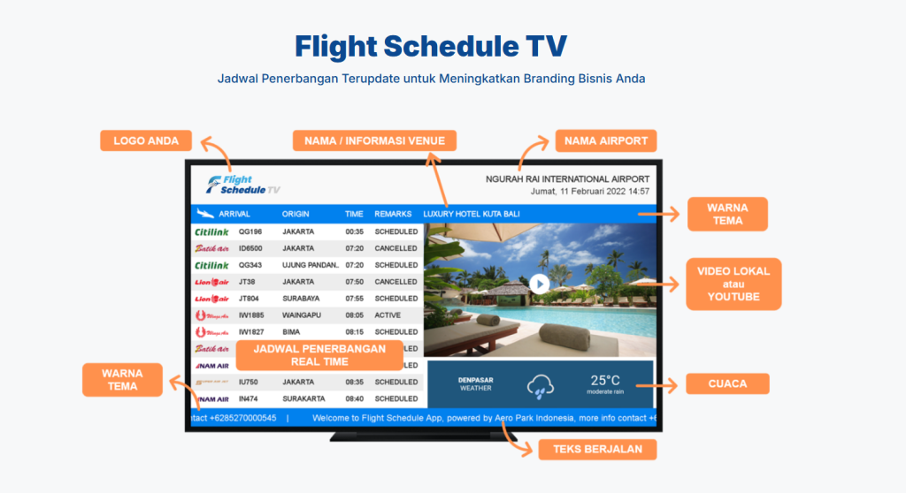 • Video & promosi — konten video atau promosi dapat disertakan di layar bersamaan dengan jadwal penerbangan. Studio Kami+1