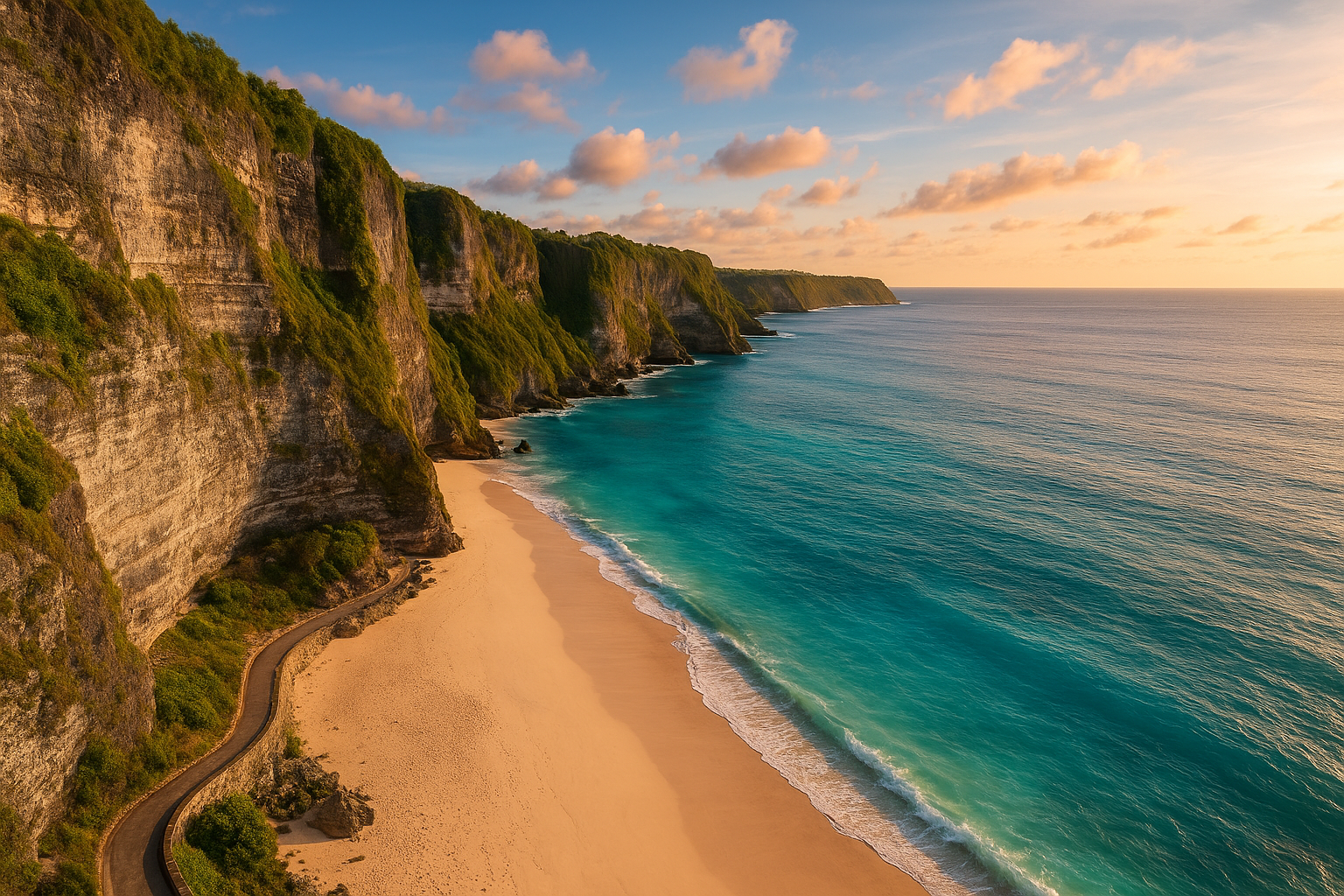 Jalan menuju Pantai Melasti membelah tebing kapur besar, menciptakan panorama dramatis yang tak bisa ditemukan di tempat lain. Saat matahari terbenam, perpaduan cahaya oranye dan biru laut menciptakan suasana yang sangat fotogenik. - Pasir Putih dan Air Jernih