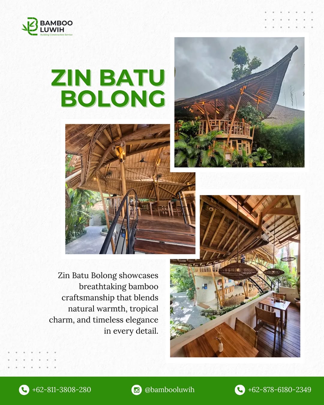 Setiap lengkungan dan sambungan bambu di Zin Batu Bolong menghadirkan nuansa alami yang menenangkan. Desain terbuka memungkinkan sirkulasi udara dan cahaya alami masuk dengan lembut, memberikan suasana sejuk dan damai khas arsitektur tropis Bali.