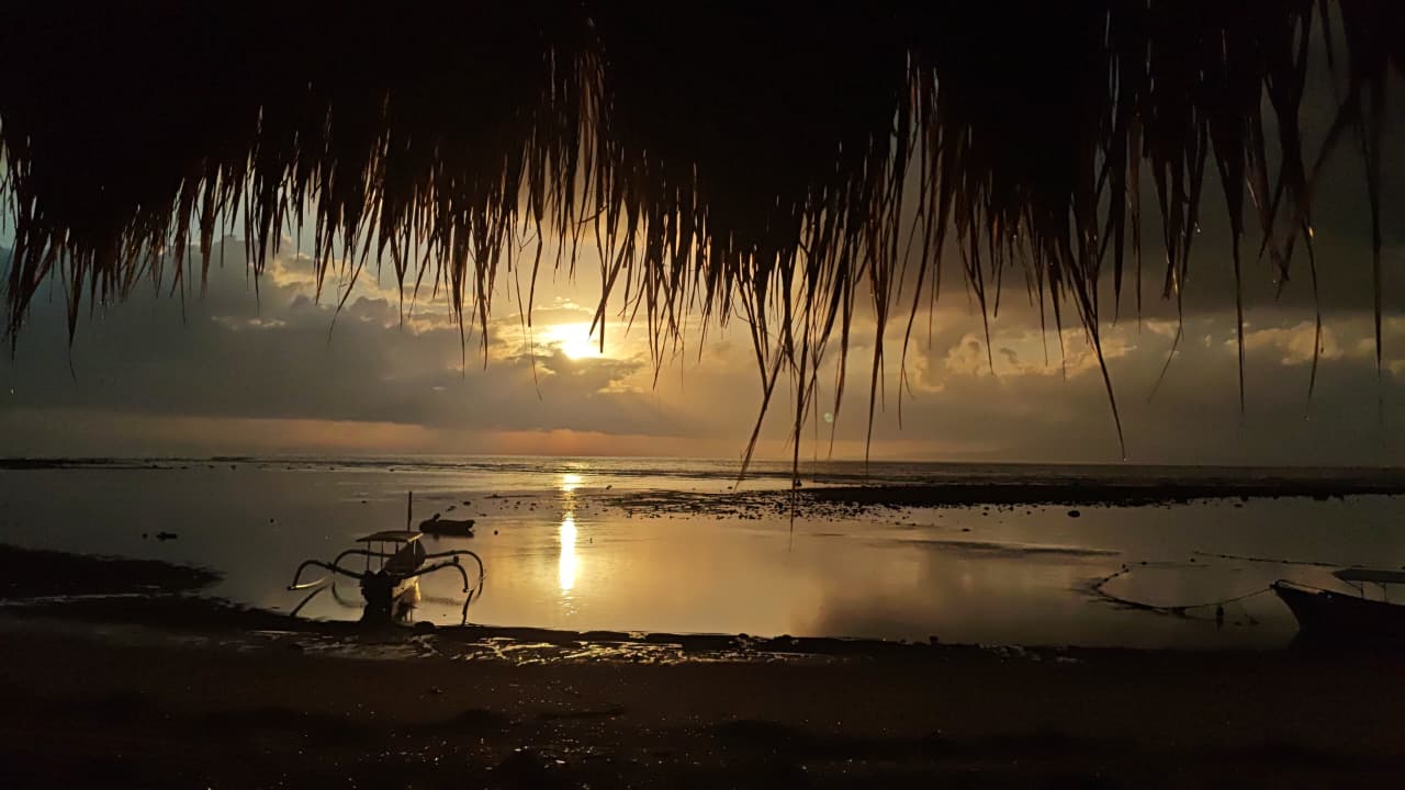 Tidak ada hiruk pikuk, tidak ada teriakan wisatawan β hanya keheningan yang menenangkan. Angin laut berhembus pelan, membawa aroma garam dan tanah basah yang khas setelah hujan. Di kejauhan, beberapa perahu nelayan tampak diam, seolah ikut menikmati momen damai ini.