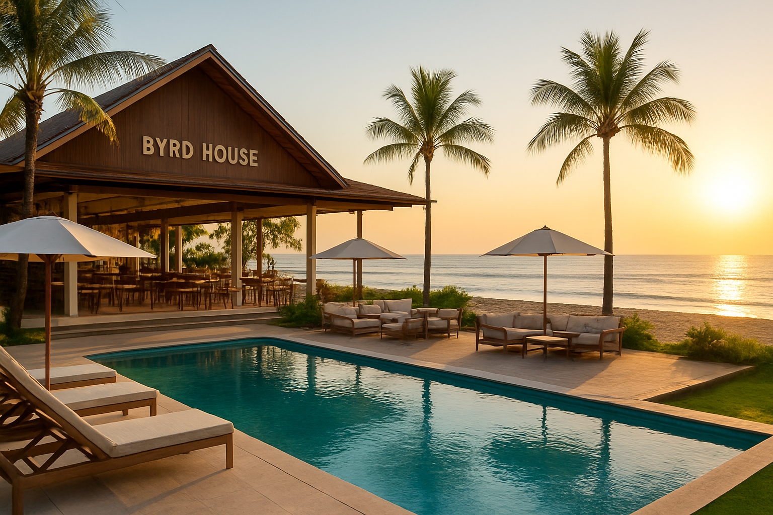 Byrd House hadir dengan desain modern yang dipadukan elemen natural seperti kayu dan anyaman, menciptakan vibes tropis yang hangat dan estetik. Area kolam, gazebo, dan beach lounge-nya jadi spot favorit pengunjung untuk relaksasi sepanjang hari.