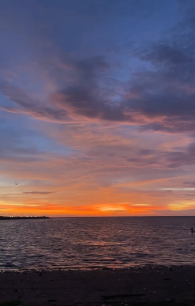 Matahari terbenam di Pantai Jerman memang punya pesonanya sendiri. Cahaya jingga perlahan turun menyentuh ombak, sementara pesawat hilir-mudik menambah suasana yang unik dan berbeda dari pantai lainnya.