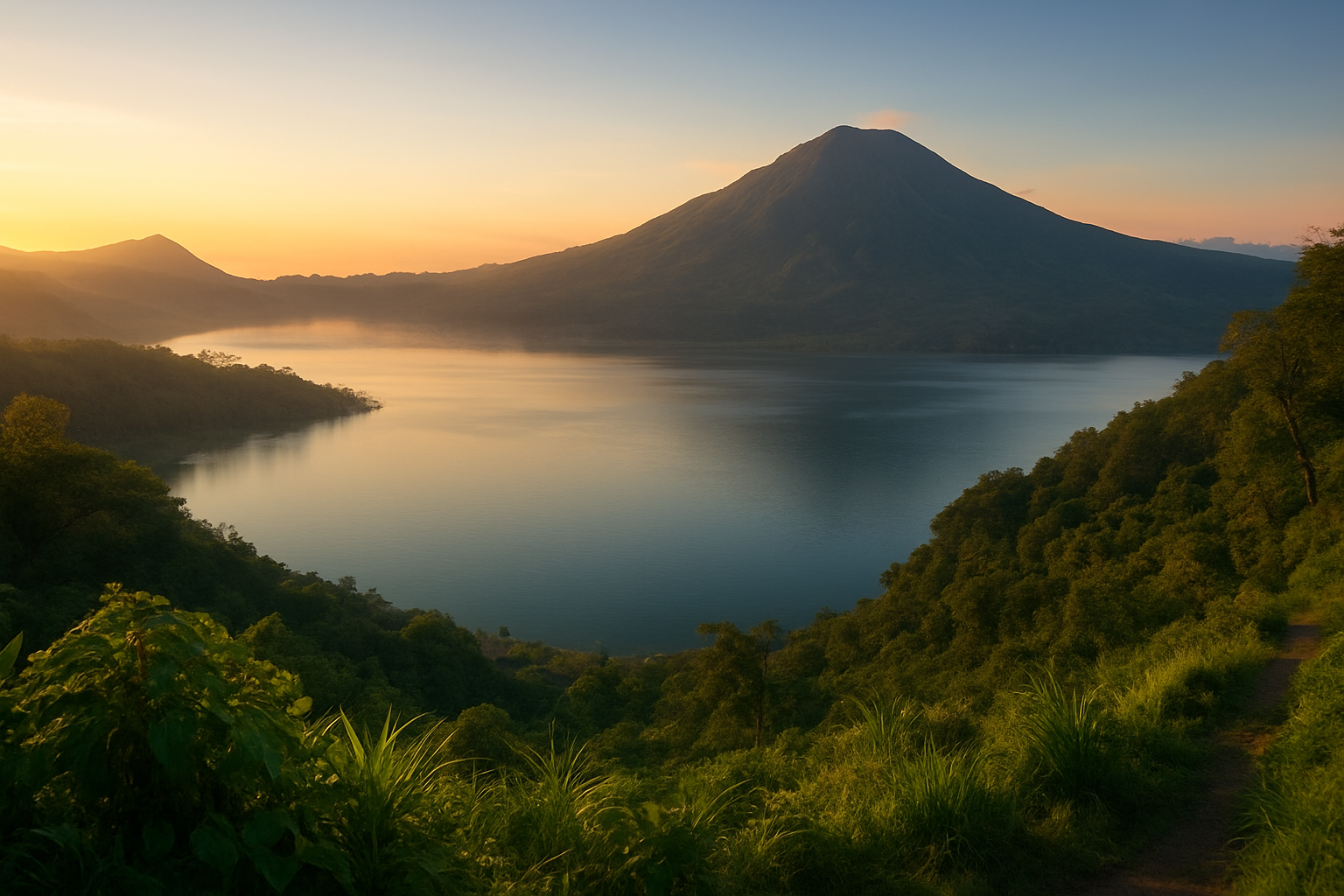 Di pagi hari, Danau Batur menunjukkan keindahannya yang paling maksimal. Matahari yang perlahan muncul dari balik perbukitan memberi cahaya keemasan yang memantul lembut di permukaan danau. Kabut tipis yang menggantung di tepian menambah kesan magis seolah-olah seluruh alam sedang menyambut hari baru. Banyak pengunjung sengaja datang lebih awal hanya untuk menikmati momen sunrisenya yang ikonik.