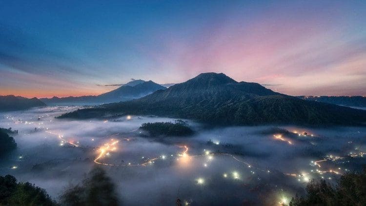 Desa Pinggan selalu dikenal sebagai salah satu spot sunrise terbaik di Bali, tapi menikmati matahari terbit dari Pohon Surga memberi pengalaman yang jauh lebih magis. Dari titik ini, kamu bisa melihat matahari perlahan muncul di balik Gunung Batur, diselimuti kabut tipis yang mengambang di atas permukiman desa.