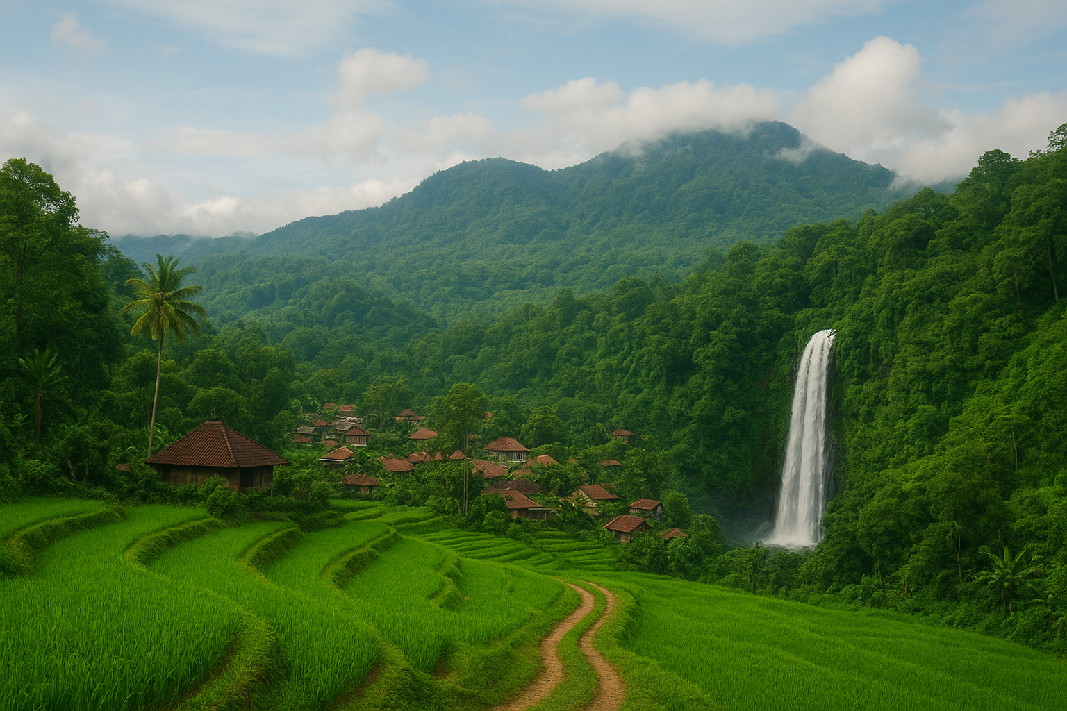 Tak jauh dari pusat desa terdapat Air Terjun Nungnung, salah satu air terjun tertinggi di Bali. Dikelilingi pepohonan lebat dan lembah hijau, tempat ini menawarkan suasana alam yang benar-benar alami. - Kehidupan Desa yang Masih Asli