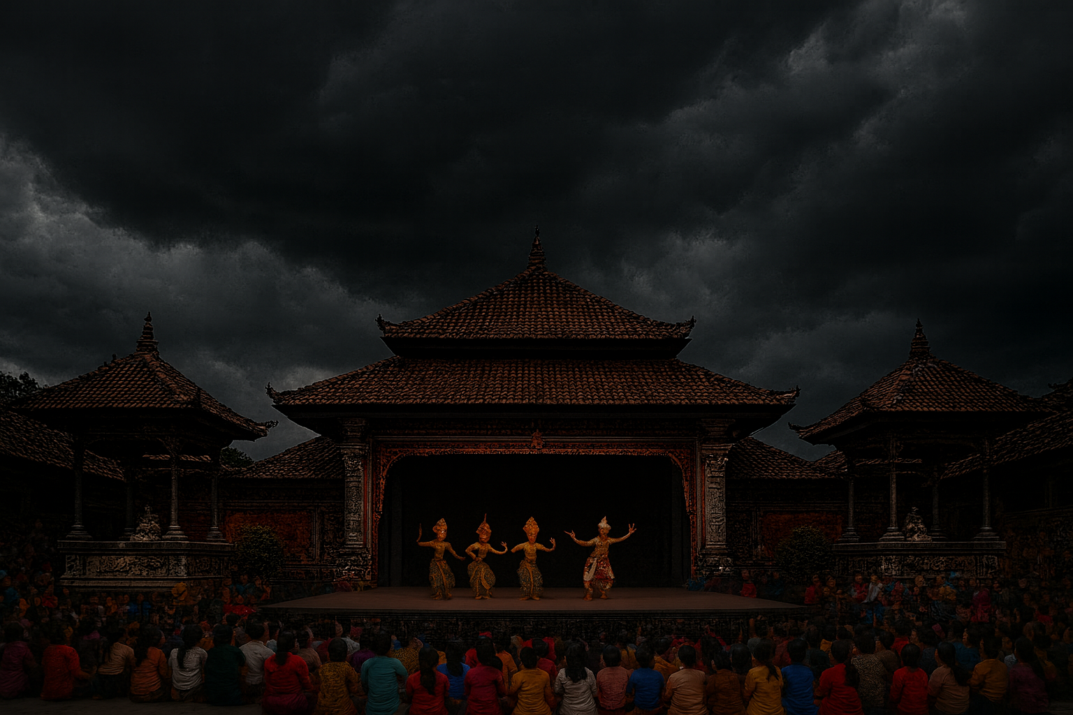 Awan gelap, panggung besar, dan detail arsitektur Bali menciptakan paduan visual yang kuat dan menarik untuk foto maupun video.