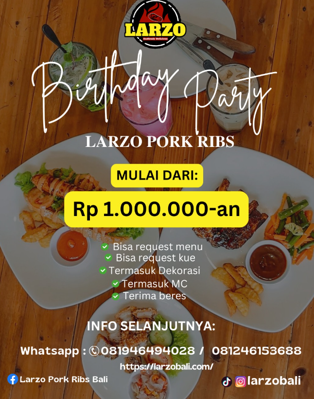 Kami mengerti betapa berharganya momen tumbuh kembang buah hati Anda. LARZO tidak hanya terkenal dengan Pork Ribs-nya yang lezat, tapi juga menjadi tempat yang sempurna untuk mengadakan pesta ulang tahun yang intim dan penuh makna.
