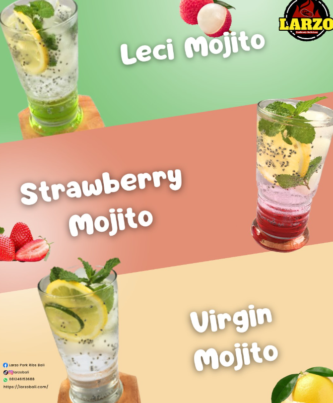 Bosan dengan minuman biasa? Di Larzo Pork Ribs, kami punya pasangan sempurna untuk hidangan pork ribs legendaris kami: Mojito yang bikin segar! Udah gak zaman cuma minum air putih, lengkapi momen santapmu dengan pilihan mojito spesial kami.