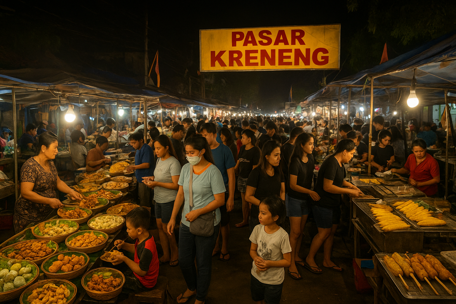 Saat malam tiba, suasana Pasar Kreneng berubah menjadi pusat jajanan yang hidup dan penuh aroma sedap. Deretan pedagang memenuhi area luar pasar, menawarkan aneka hidangan yang siap memanjakan lidah. Beberapa menu yang wajib dicoba antara lain sate lilit, tipat cantok, rujak kuah pindang, nasi jinggo, hingga jajanan Bali seperti laklak dan klepon.
