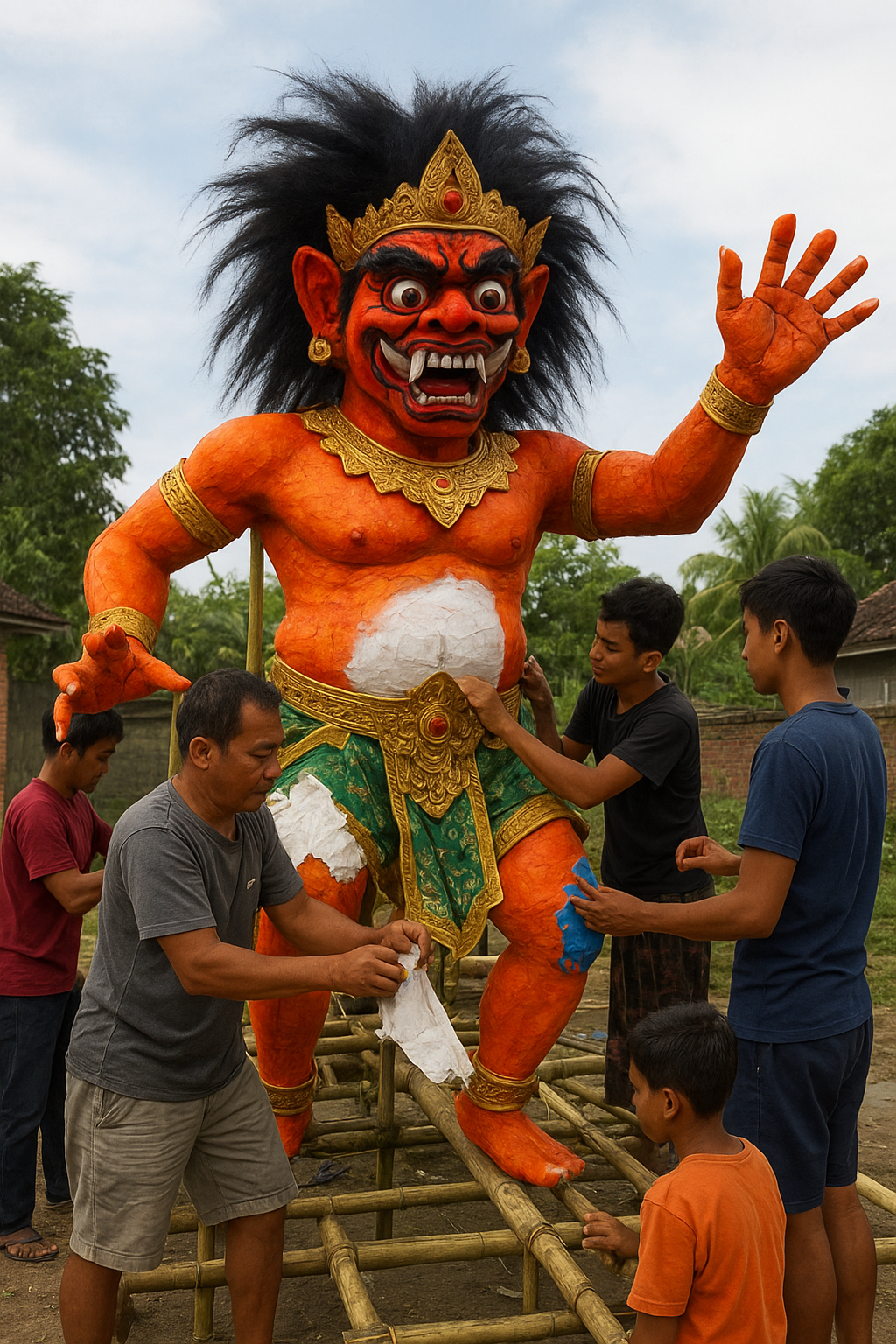 Proses dimulai dari perancangan sketsa. Setiap kelompok banjar menentukan tema dan bentuk ogoh sesuai tradisi Bali. Setelah sketsa disetujui, kerangka bambu dibentuk sebagai struktur utama. Selanjutnya, bahan ringan seperti kertas, kain, dan styrofoam ditempel untuk membentuk tubuh dan kepala Ogoh-Ogoh. Warga secara bergotong-royong menghias dan mewarnai patung, menghasilkan detail yang menarik dan mencolok.