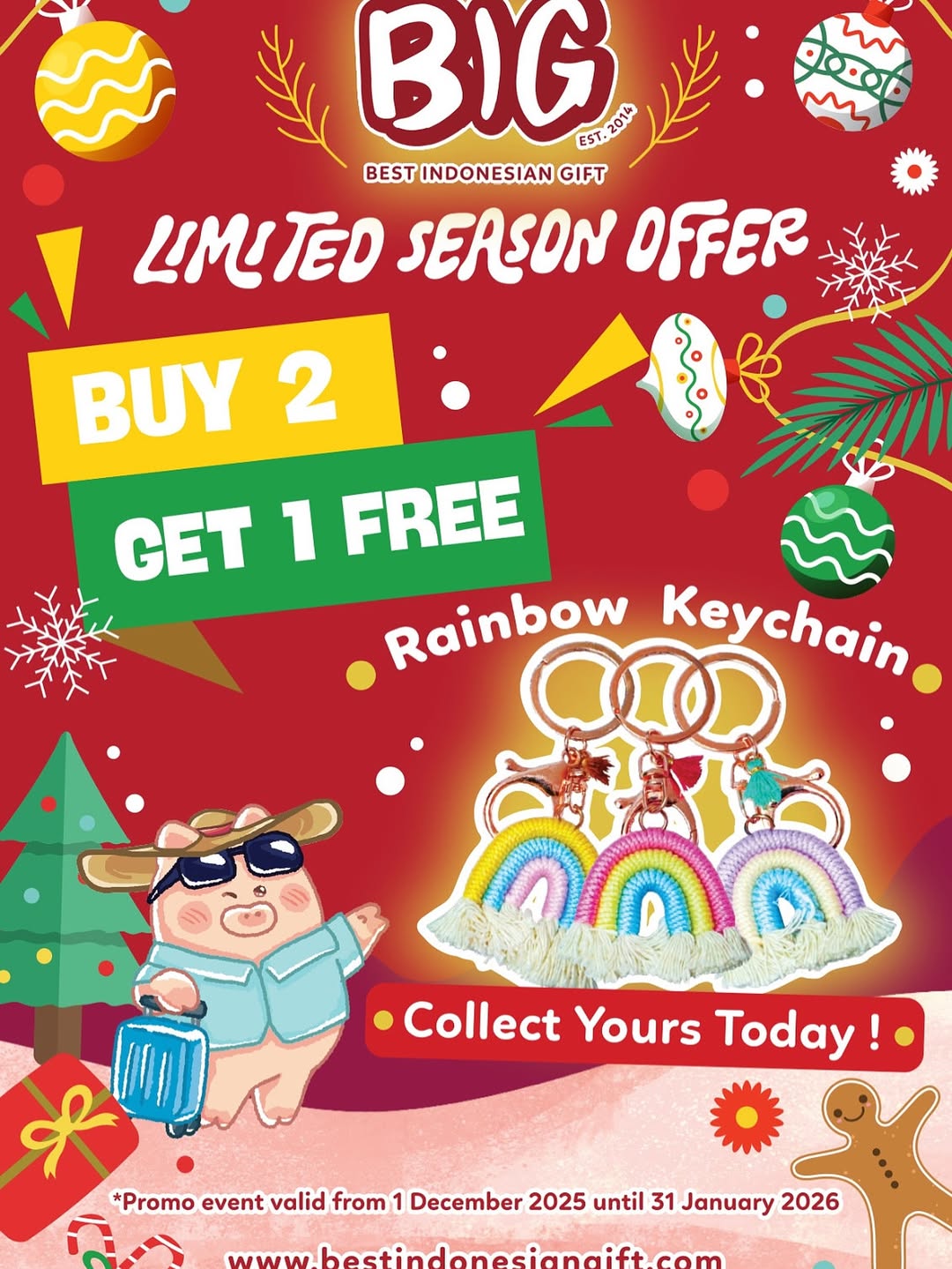 Bagi Anda yang gemar mengoleksi aksesoris unik atau sedang mencari hadiah menarik dengan harga terjangkau, kini saatnya berburu Rainbow Keychain dari Best Indonesian Gift! Dalam promo terbatas yang berlangsung mulai 1 Desember 2025 hingga 31 Januari 2026, Anda bisa menikmati penawaran menarik Buy 2 Get 1 Free.