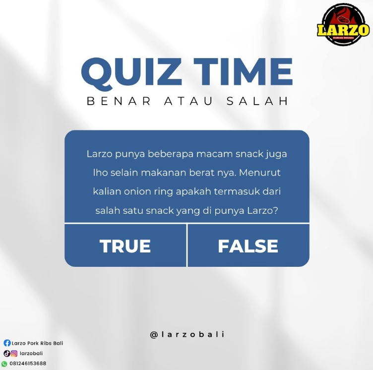 Hai, food enthusiast! Larzo Pork Ribs kembali hadir dengan kuis seru untuk menguji seberapa jauh kamu mengenal menu kami. Kali ini, kita bahas tentang pilihan snack enak di Larzo!