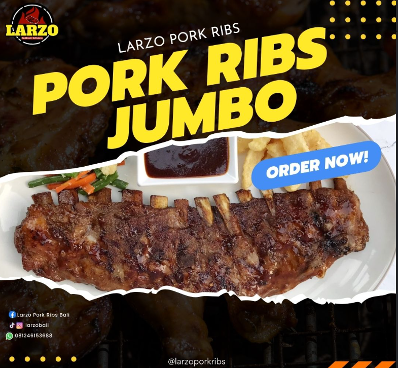 Pernahkah Anda membayangkan gigitan pertama pork ribs dengan daging yang begitu empuk, hingga terlepas dari tulangnya dan meleleh begitu saja di mulut? Jika belum, inilah saatnya Anda merasakannya. Larzo Pork Ribs menghadirkan pengalaman kuliner terbaik dengan menu andalannya: Pork Ribs Jumbo yang tak hanya besar, tetapi juga luar biasa juicy dan lembut.