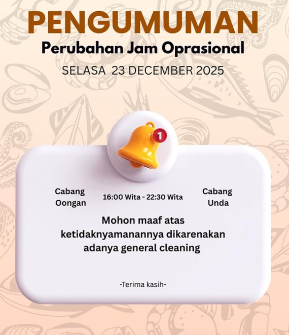 Perubahan ini kami lakukan dalam rangka pelaksanaan general cleaning menyeluruh di kedua restoran. Aktivitas bersih-bersih besar ini merupakan komitmen kami untuk terus menjaga standar kebersihan, kenyamanan, dan keselamatan yang tinggi bagi seluruh pelanggan tercinta.