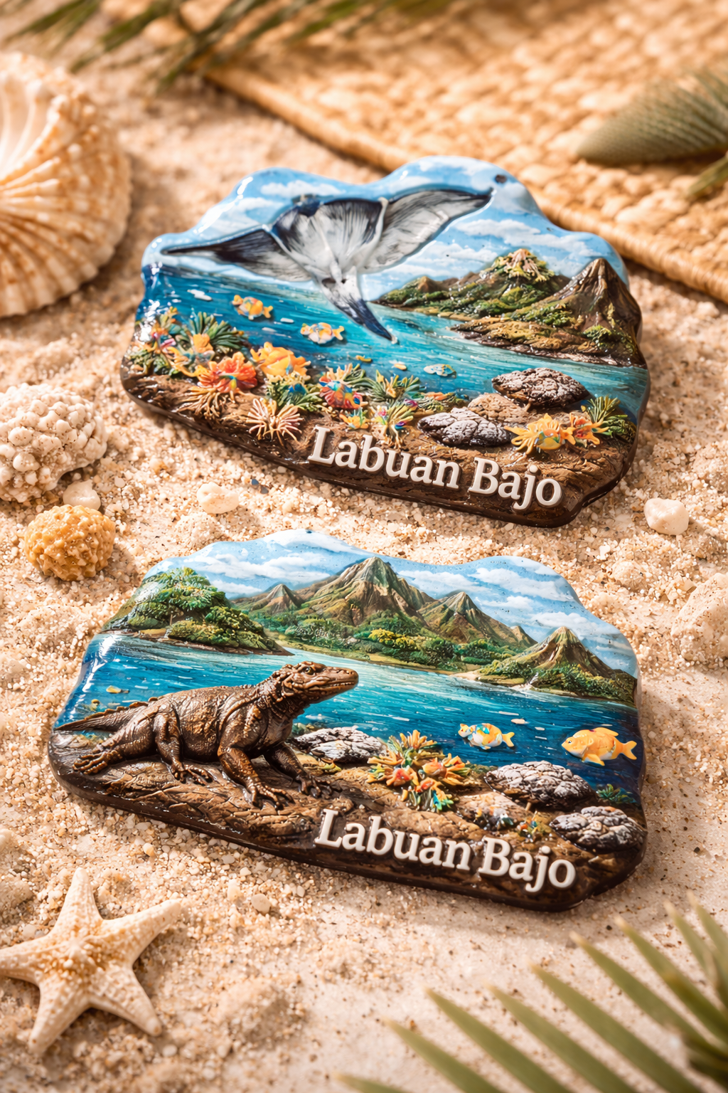 Souvenir ini dirancang untuk menangkap keindahan tersebut dalam bentuk epoxy magnet dengan finishing glossy yang kuat dan tahan lama. Detail visual yang tajam membuat ikon laut dan darat tampil hidup, seolah mengajak Anda kembali ke momen perjalanan yang tak terlupakan.