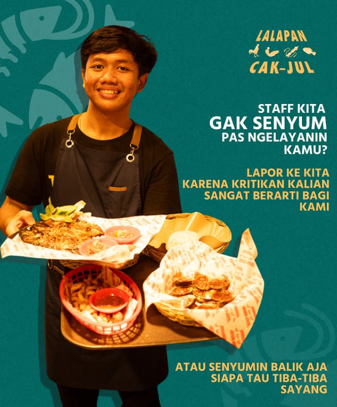 Di Lalapan Cak-Jul, kami percaya bahwa pengalaman makan yang berkesan tidak hanya terletak pada cita rasa makanan, tetapi juga pada interaksi yang hangat antara staf dan pelanggan. Sebuah senyuman tulus dapat menjadi pembuka percakapan, penghilang penat, dan tanda bahwa kehadiran Anda sangat dihargai.