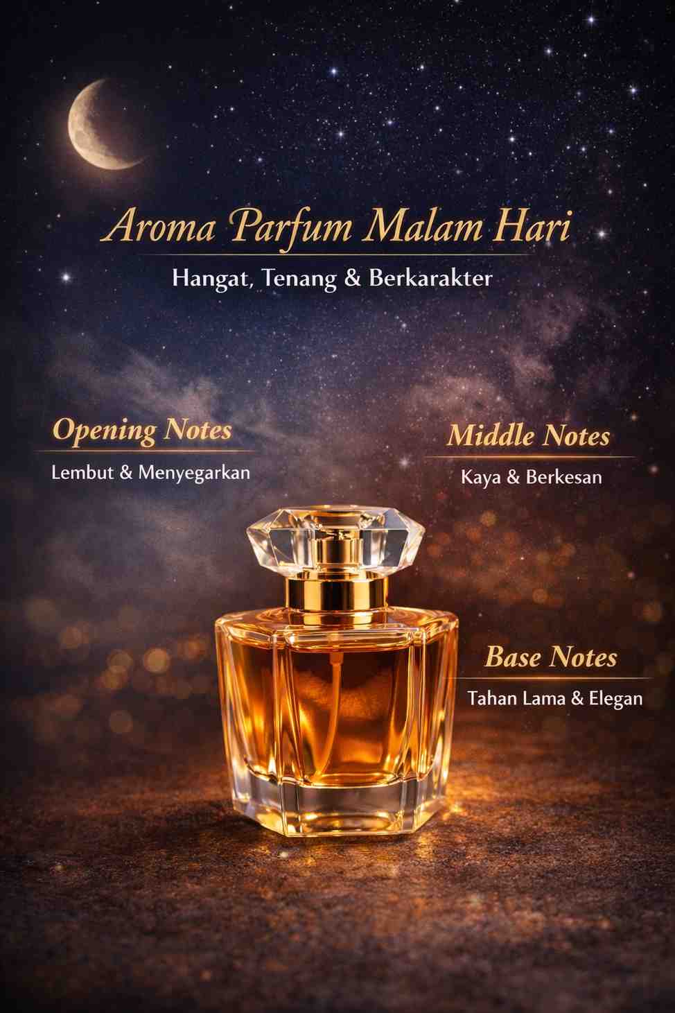 Parfum malam ditutup dengan base notes yang kuat dan membekas. Aroma woody, amber, musk, atau vanilla membantu wangi bertahan lebih lama dan meninggalkan kesan mendalam.