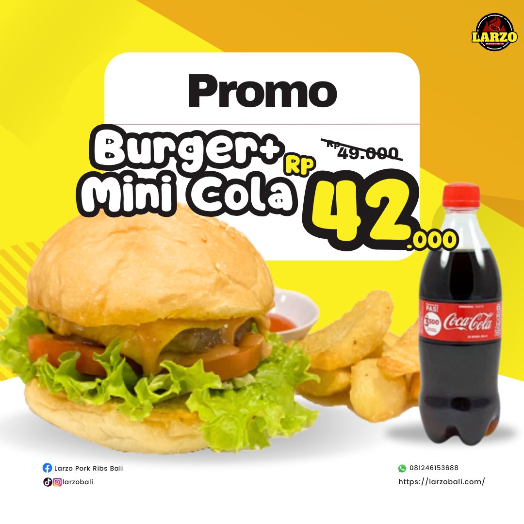 Bagi pecinta burger, saat ini tersedia promo spesial Burger dengan harga Rp42.000 saja. Dalam promo ini, kamu bisa memilih antara Chicken Burger atau Beef Burger, lengkap dengan cola sebagai minumannya. Promo ini cocok untuk semua kesempatan—makan siang, makan malam, atau hanya sekadar ngemil cepat tanpa repot.