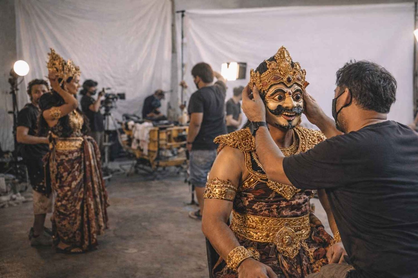 Salah satu proses utama dalam persiapan shooting film pendek Epos Ramayana adalah pemasangan topeng Paras Kama. Topeng ini menjadi elemen penting dalam membangun karakter dan identitas visual tokoh yang akan ditampilkan. Pemasangan dilakukan dengan cermat untuk memastikan kenyamanan pemain sekaligus menjaga detail visual agar sesuai dengan karakter dalam cerita.