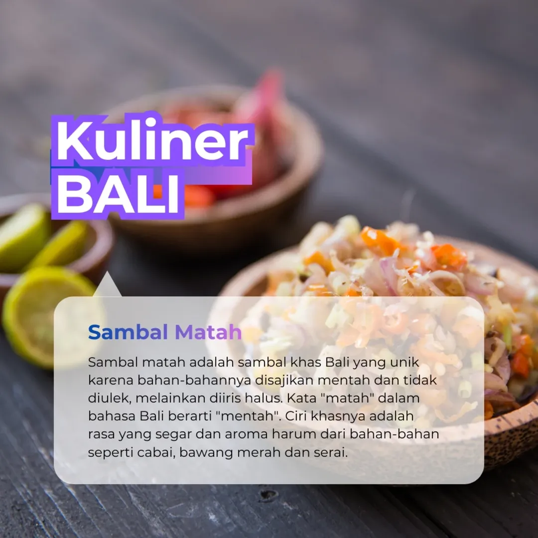 Bagi wisatawan yang datang ke Bali, mencicipi Sambal Matah Khas Bali adalah pengalaman kuliner yang wajib dicoba. Kesegaran bahan-bahan mentahnya dan aroma harum dari terasi dan serai membuat sambal ini menjadi simbol cita rasa Pulau Dewata yang autentik. Menikmati hidangan Bali tanpa sambal matah rasanya kurang lengkap, karena sambal ini benar-benar menghadirkan pengalaman rasa yang otentik dan tak terlupakan.