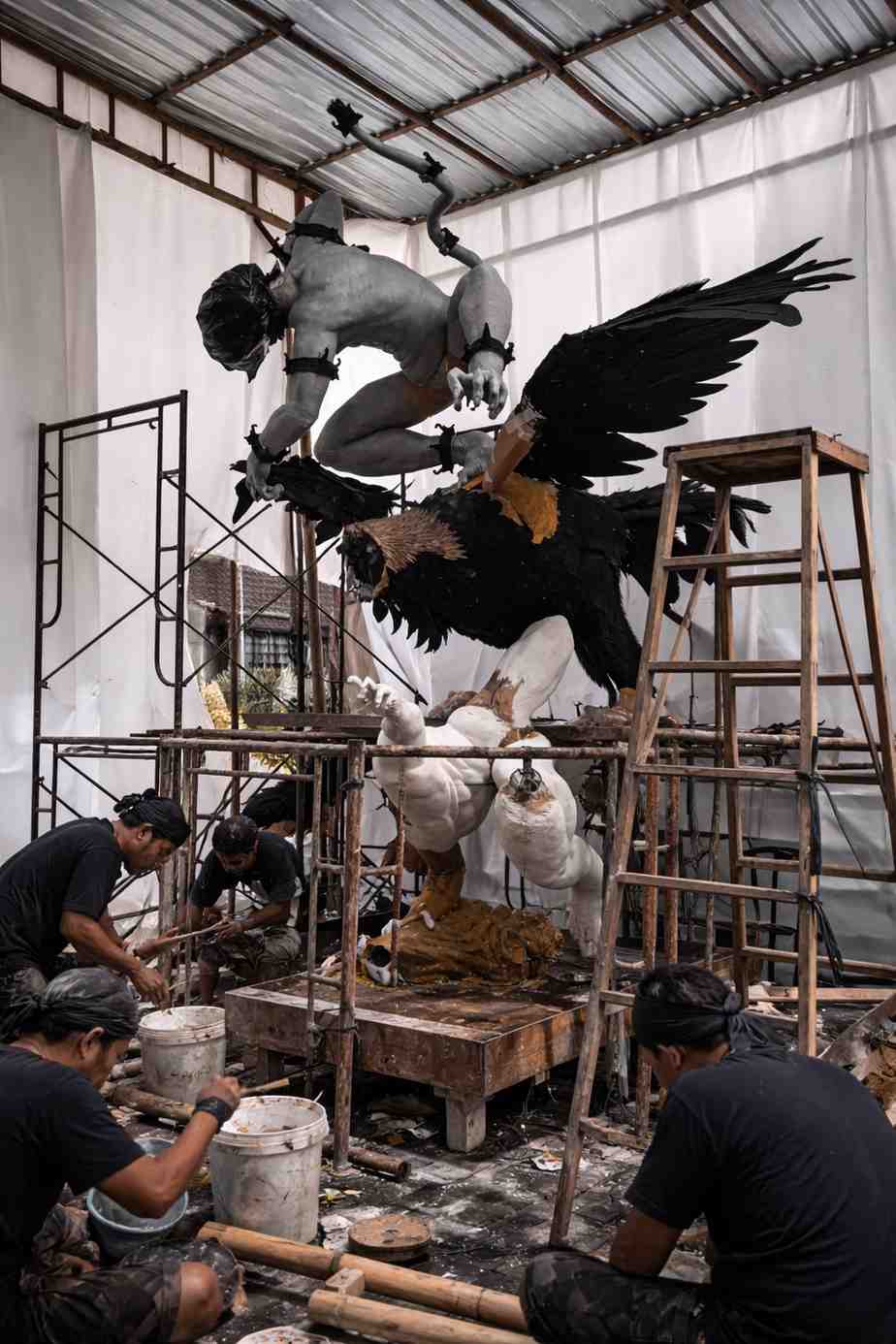 Struktur bertingkat seperti ini biasanya menjadi tantangan tersendiri. Selain memperhatikan kekuatan rangka, pembuat juga harus memastikan bahwa setiap bagian tubuh terhubung dengan baik dan tidak mengganggu keseimbangan keseluruhan karya. Inilah mengapa proses ini menjadi salah satu fase terpenting dalam pembuatan ogoh-ogoh.