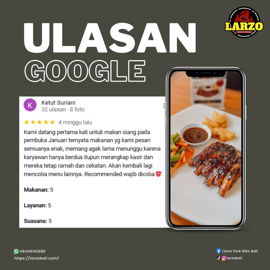 Mencari tempat makan pork ribs di Denpasar dengan rasa enak, pelayanan ramah, dan suasana nyaman? Salah satu ulasan terbaru di Google menunjukkan pengalaman positif dari pengunjung yang pertama kali mencoba Larzo Pork Ribs — dan langsung memberi rating sempurna.