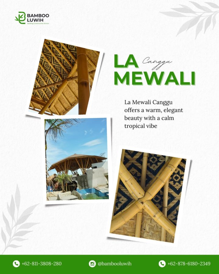 La Mewali menampilkan struktur bambu yang dirancang dengan detail elegan dan bentuk yang anggun. Material alami ini tidak hanya memberikan kesan estetis, tetapi juga menciptakan hubungan yang harmonis antara bangunan dan lingkungan tropis Bali.