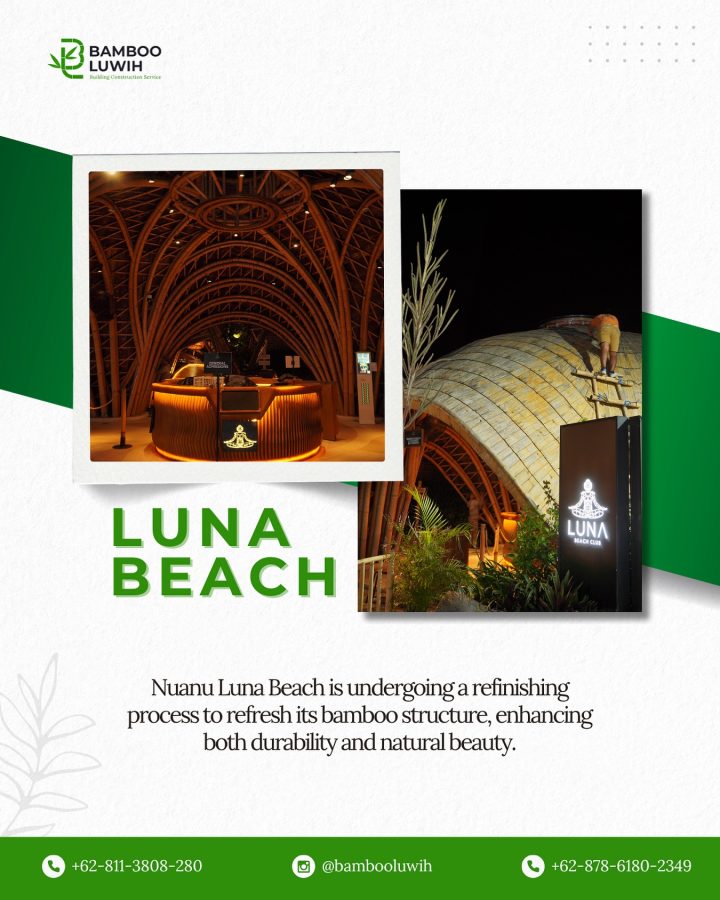 Nuanu Luna Beach dikenal dengan desain bambunya yang menyatu dengan alam. Proses refinishing dilakukan dengan tetap mempertahankan: