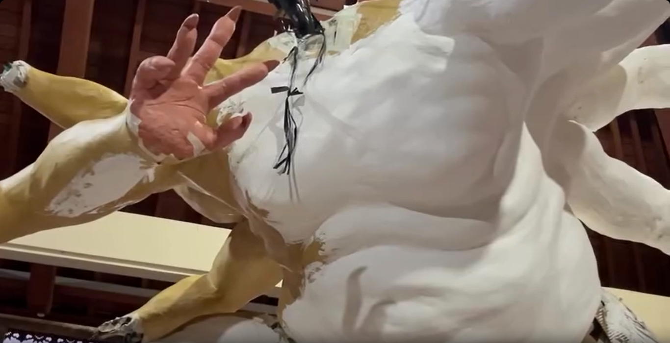 - Konstruksi Rangka (Ulatan): Para pemuda menggunakan bambu pilihan yang dianyam secara manual untuk membentuk struktur anatomi. Penggunaan bahan ramah lingkungan menjadi prioritas utama untuk mendukung kampanye bebas limbah plastik.