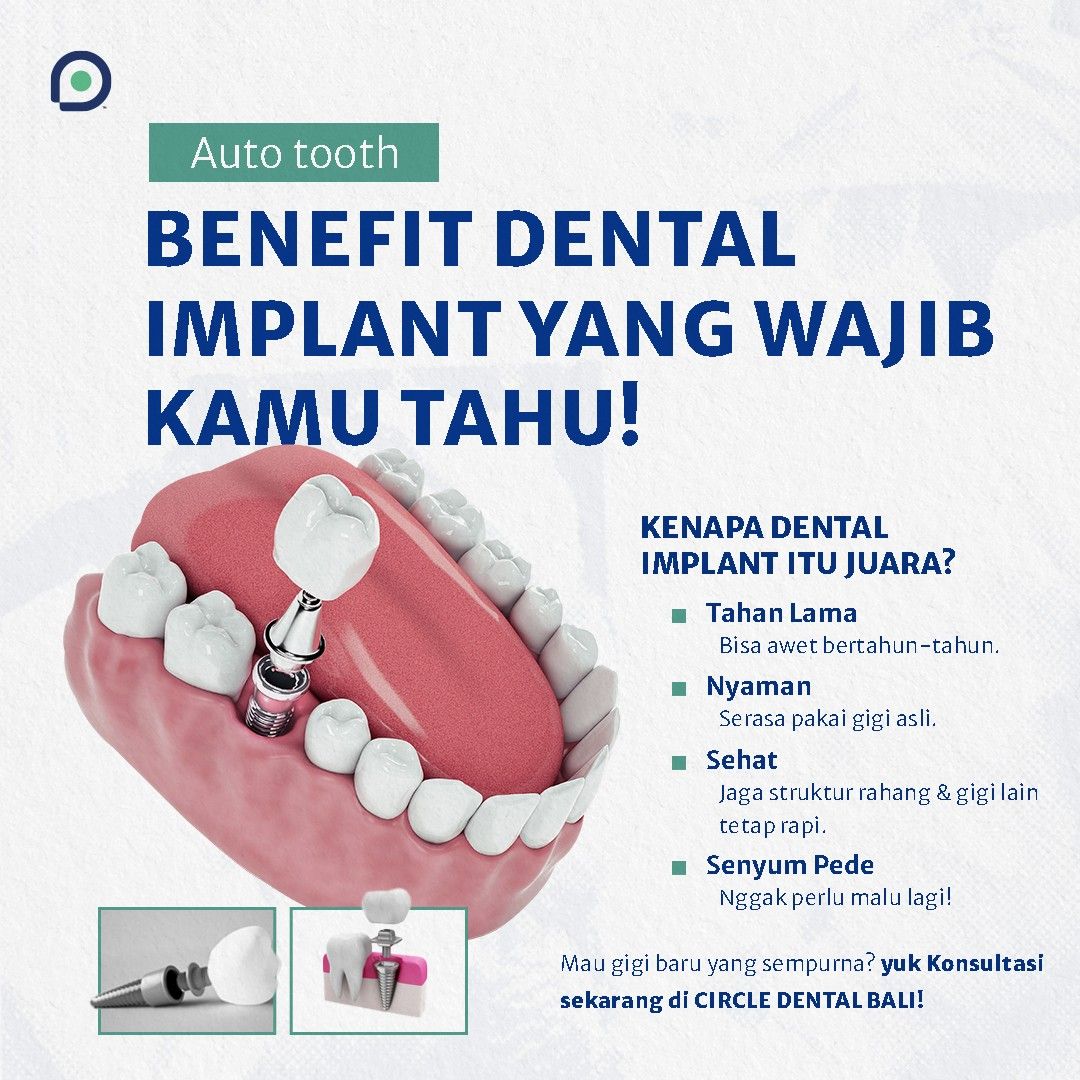 Dental implant merupakan prosedur penanaman akar gigi buatan yang terbuat dari bahan khusus dan ditanam pada tulang rahang. Implant berfungsi sebagai penopang gigi pengganti sehingga memberikan hasil yang kuat, stabil, dan menyerupai gigi asli.