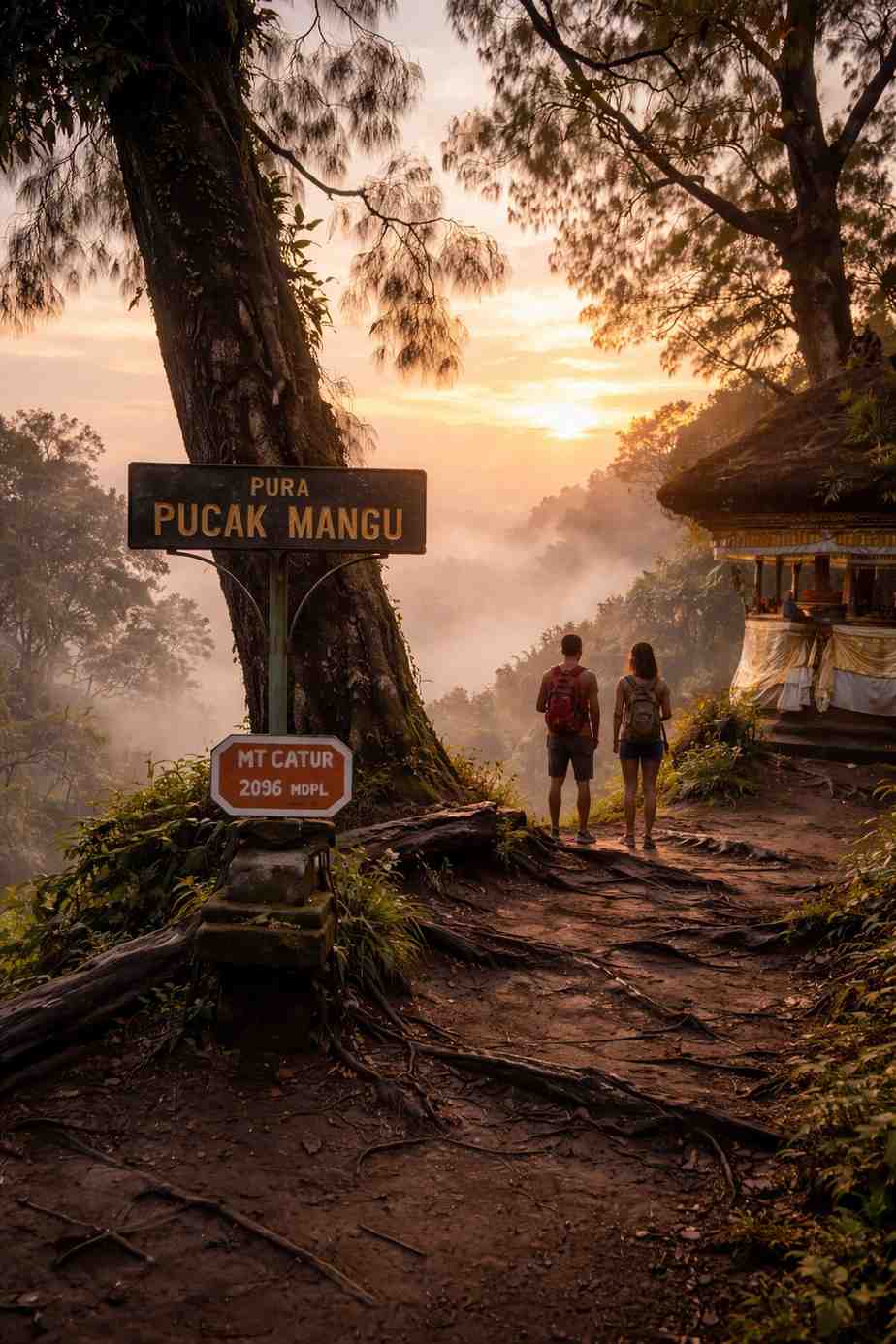 Mendaki Gunung Catur Bali pada sore hari menghadirkan pengalaman yang berbeda dari pendakian biasa. Kabut tipis turun perlahan menyelimuti jalur menuju Pura Pucak Mangu. Suasana menjadi syahdu dan tenang. Saat matahari mulai terbenam, cahaya senja yang hangat memantul di antara pepohonan hutan pegunungan.