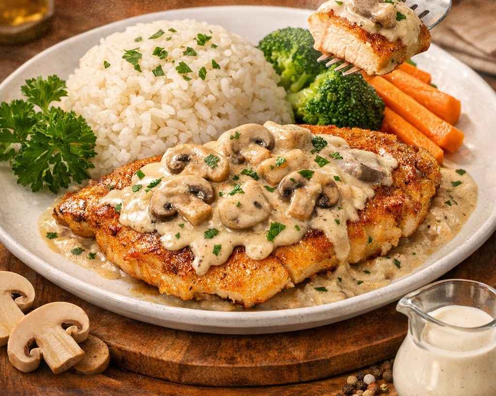 Rasanya creamy, gurih, dan lembut dengan perpaduan ayam juicy serta saus jamur yang kaya namun tetap ringan.