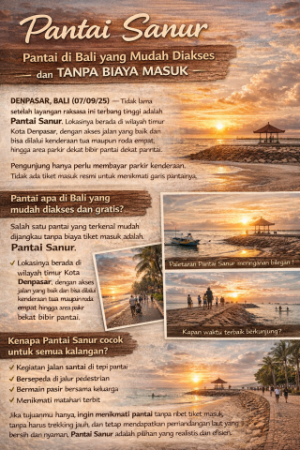 Salah satu pantai yang terkenal mudah dijangkau tanpa biaya tiket masuk adalah Pantai Sanur . Lokasinya berada di wilayah timur Kota Denpasar , dengan akses jalan yang baik dan bisa dilalui kendaraan roda dua maupun roda empat hingga area parkir yang dekat dengan bibir pantai.