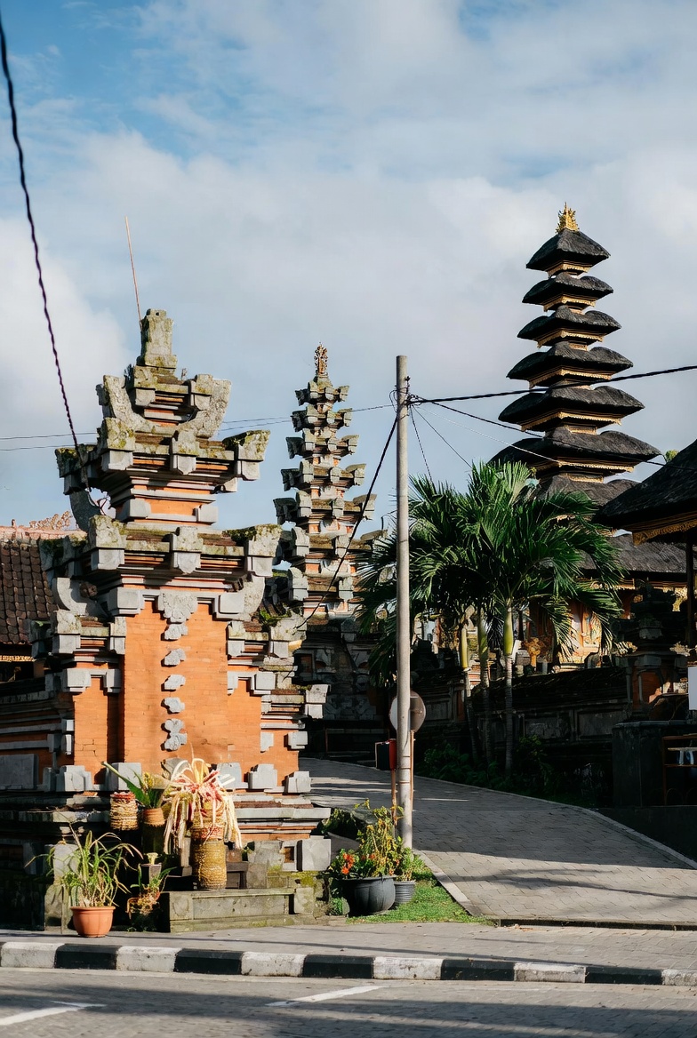 Sinar matahari yang perlahan muncul dari ufuk timur menyinari pelinggih dan gapura candi bentar, menciptakan siluet arsitektur khas Bali yang artistik. Aroma dupa yang mengepul berpadu dengan suara gamelan yang lembut menghadirkan pengalaman budaya yang autentik bagi masyarakat maupun wisatawan yang melintas.