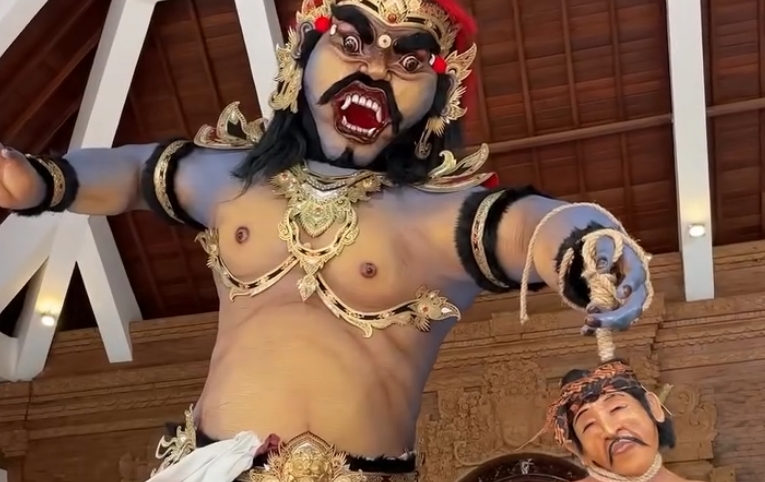 - Kreativitas teknik pewarnaan yang menonjolkan tekstur kulit serta detail busana tradisional pada figur patung raksasa tersebut.