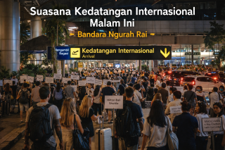 Bagaimana suasana kedatangan internasional di Bandara Ngurah Rai pada malam hari? Area kedatangan internasional di Bandar Udara Internasional I Gusti Ngurah Rai biasanya tetap ramai hingga larut malam. Penerbangan dari berbagai negara tiba secara bergelombang, sehingga arus penumpang terlihat dinamis.