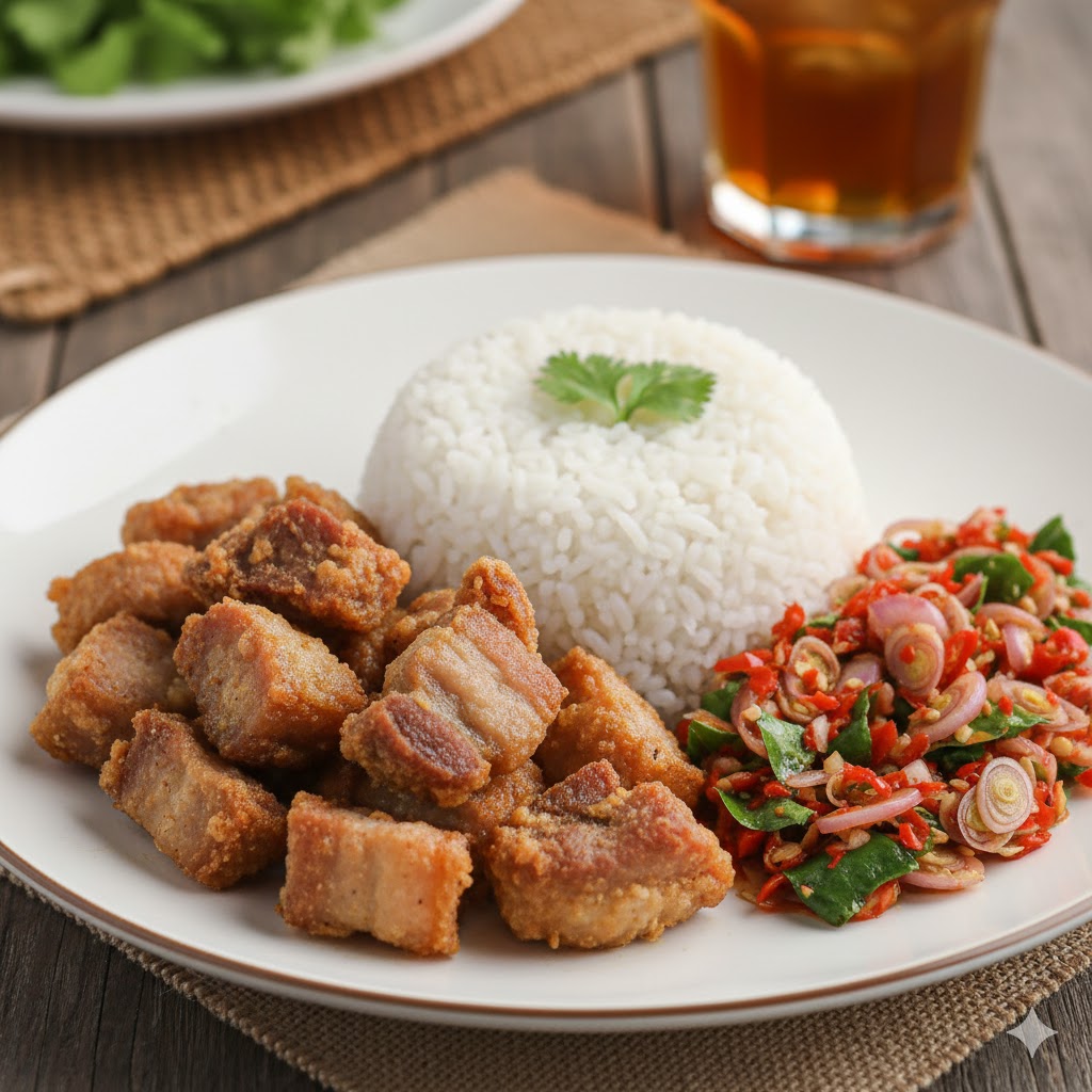 Potongan babi goreng dipilih dengan kualitas terbaik, dimasak hingga empuk tetapi tetap gurih, membuat setiap suapan terasa memuaskan.