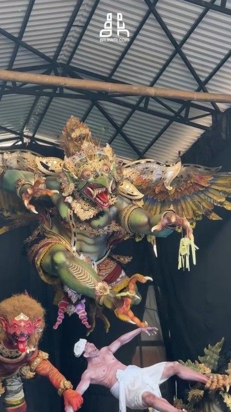 • Komposisi Dinamis: Ogoh-ogoh ini tidak hanya berdiri statis, tetapi menceritakan narasi pertempuran atau perlindungan terhadap manusia, terlihat dari figur manusia di bagian bawah yang memberikan kesan drama.