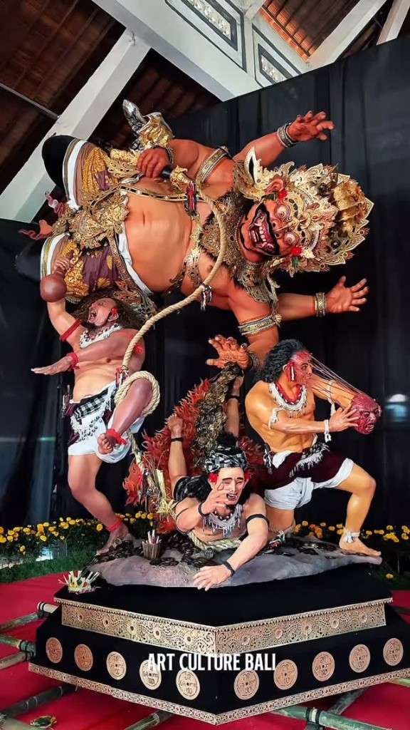 - Anatomi dan Proporsi: Penggarapan otot, lipatan kulit, hingga jemari tangan menunjukkan keahlian tinggi para pemuda (Sekaa Teruna) Br. Taman dalam mengolah bahan ramah lingkungan.
