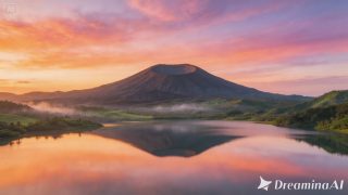 Di sisi lain, cahaya matahari yang perlahan menyinari lereng gunung membuat warna alam terlihat semakin jelas. Pepohonan hijau, hamparan lahan pertanian, serta danau yang berkilau menciptakan pemandangan yang sangat memanjakan mata.