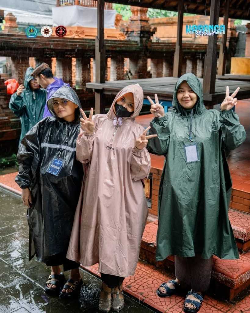 - Jas Hujan Ikonik: Panitia terlihat kompak mengenakan jas hujan (poncho) berbagai warna, mulai dari hitam, merah muda, hingga hijau botol.
