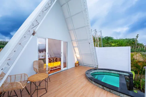 Selain itu, villa staycation Kintamani Bali biasanya dirancang dengan konsep alam. Desain bangunan sering menggunakan material kayu, kaca besar, dan teras terbuka sehingga tamu bisa menikmati pemandangan tanpa terhalang.