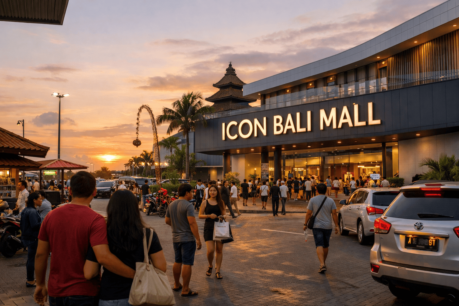 Sore hari selalu memberikan nuansa yang berbeda di kawasan belakang Icon Bali Mall. Ketika matahari mulai menurun di ufuk barat, area ini perlahan berubah menjadi ruang yang dipenuhi aktivitas pengunjung. Beberapa orang berjalan santai menuju pintu masuk mall, sementara lainnya terlihat meninggalkan area parkir setelah menghabiskan waktu berbelanja.