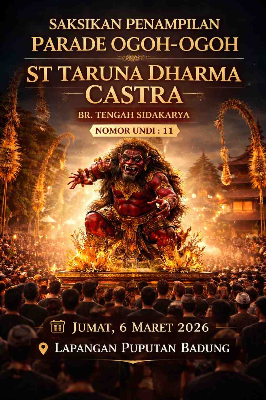 Penampilan ogoh-ogoh dari ST Taruna Dharma Castra akan berlangsung pada Jumat, 6 Maret 2026. Kegiatan ini menjadi momen penting bagi para peserta untuk menampilkan karya terbaik mereka.