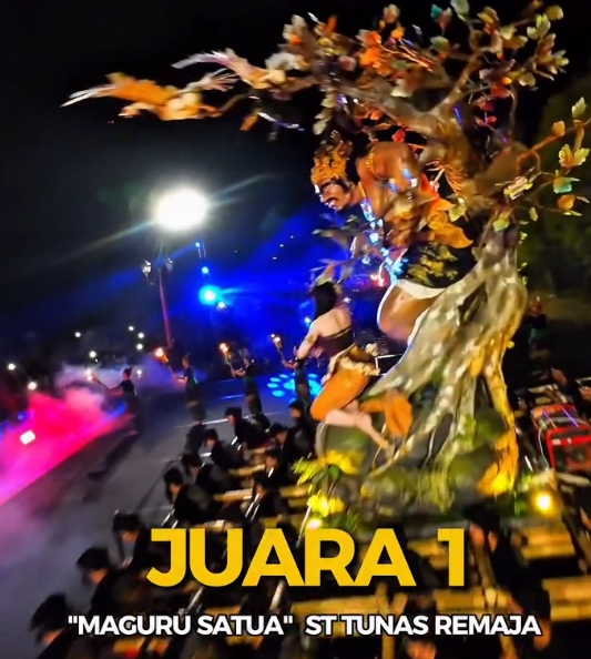 Posisi pertama berhasil diamankan oleh ST. Tunas Remaja dengan karya mereka yang bertajuk “MAGURU SATUA”. Mereka sukses meraih nilai tertinggi sebesar 914 poin berkat detail anatomi yang sangat luar biasa halus. Oleh karena itu, gelar juara bertahan pun masih kokoh berada di genggaman banjar berprestasi ini.
