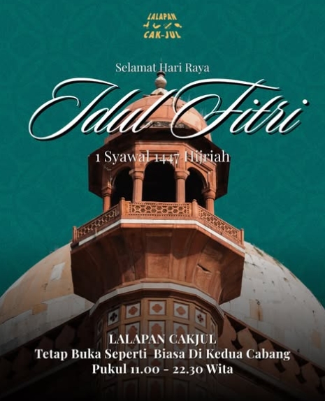 Segenap tim Lalapan Cak Jul mengucapkan selamat Hari Raya Idul Fitri bagi sobat setia. Semoga kebahagiaan, keberkahan, dan kehangatan selalu menyertai langkah kita semua di hari ini. Di sisi lain, kami tetap berkomitmen memberikan pelayanan terbaik bagi para pengunjung semua. Sebagai tambahan, kebersihan area makan selalu kami jaga demi kenyamanan keluarga besar Anda. Selain itu, pelayanan yang ramah tetap menjadi prioritas utama kami di hari raya. Oleh sebab itu, jangan ragu untuk membawa rombongan besar ke tempat kami.