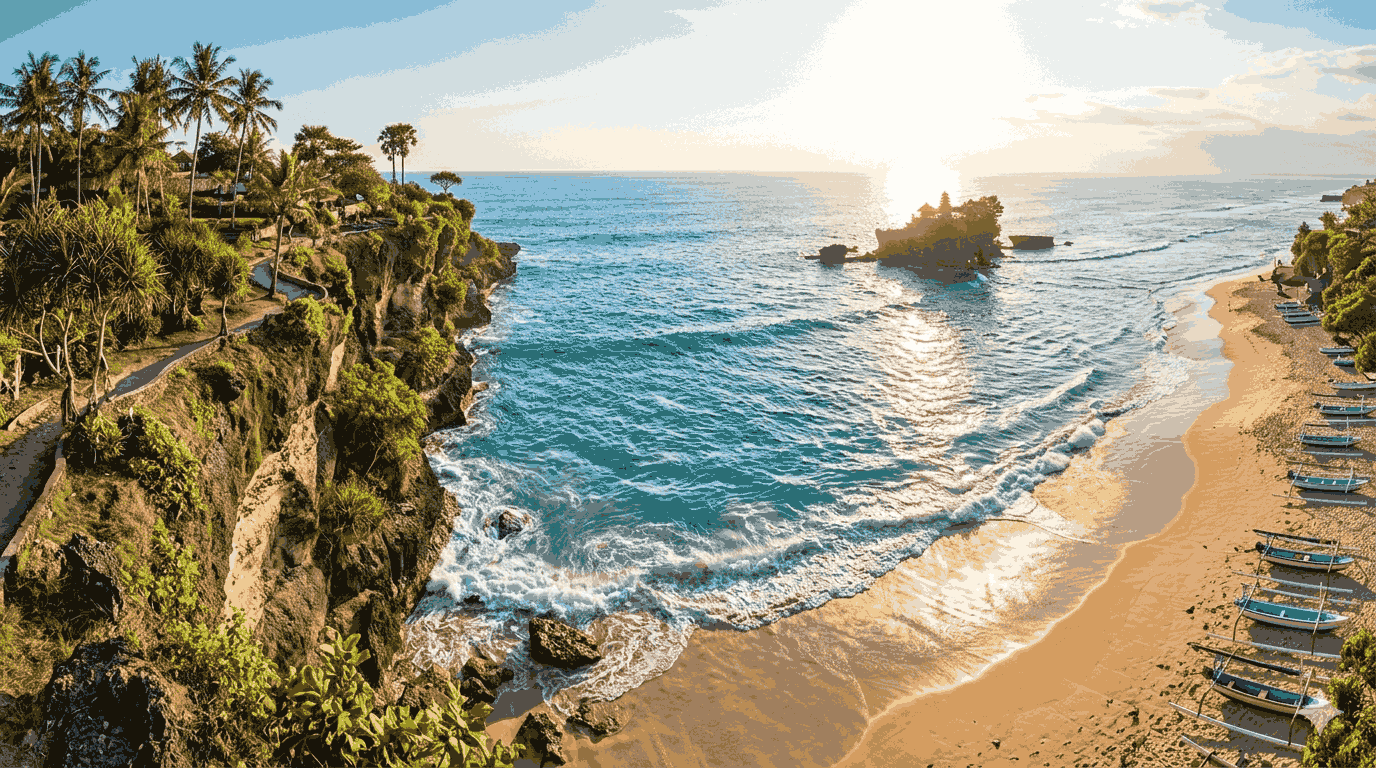 Pantai Pererenan di Badung, Bali, terkenal dengan pasir hitamnya yang unik. Pantai ini menawarkan ombak ideal yang menjadi magnet bagi para peselancar dunia. Ikon utama tempat ini adalah patung Gajah Mina yang berdiri megah di tepi pantai. Selain berselancar, kamu bisa menikmati matahari terbenam yang sangat dramatis di sini. Suasananya jauh lebih tenang dibandingkan kawasan Canggu yang mulai padat. Pererenan adalah perpaduan sempurna antara gaya hidup modern dan ketenangan pedesaan Bali.