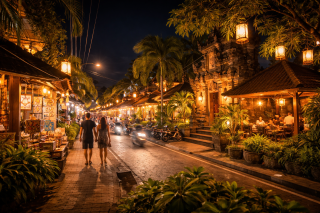 Saat malam tiba, Ubud berubah menjadi tempat yang penuh ketenangan dengan sentuhan kehangatan khas Bali. Lampu-lampu jalan yang temaram menciptakan suasana yang nyaman dan menenangkan, sangat berbeda dari hiruk pikuk siang hari.