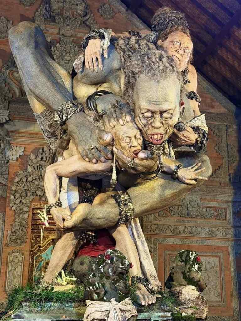 - Komposisi Tekstur: Penggunaan bahan yang memberikan tekstur kasar dan gelap pada figur utama, dikontraskan dengan detail ornamen emas, memperkuat nuansa Misteri Tugu Mayang Ubud.